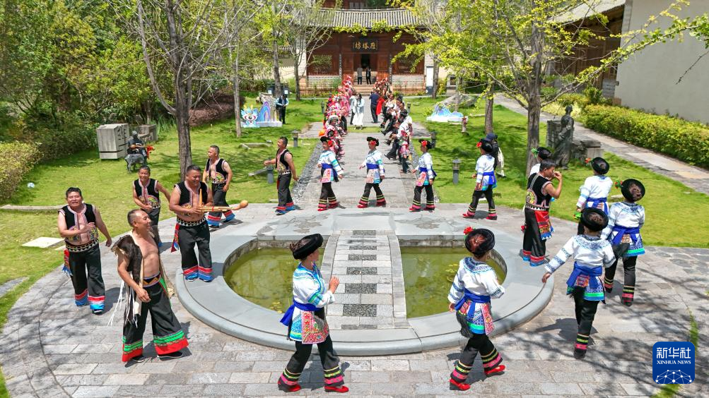 7月18日,彝族打歌队在巍山县文华书院排练(无人机照片)。