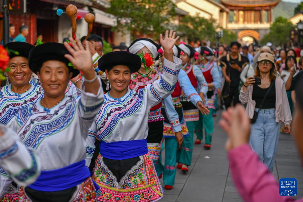 7月18日,彝族打歌队队员在巍山县南诏古街进行巡演时向游客挥手致意。
