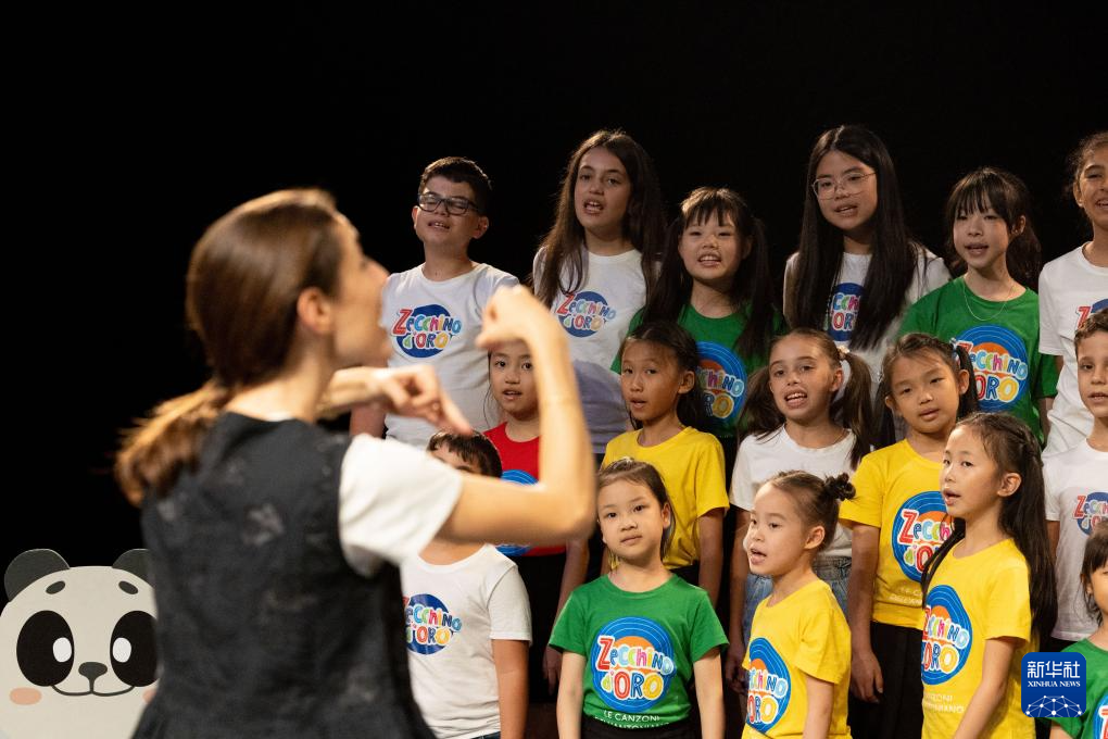 7月18日,在意大利博洛尼亚,绣球花小合唱团与安东尼亚诺小合唱团的团员们一起练习歌曲。