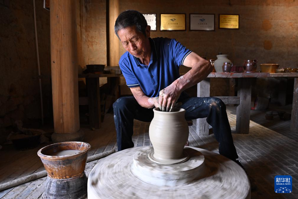 在福建省周宁县浦源镇萌源村月山古龙窑,萌源制硋世家第七代传人、年过七旬的肖家涨一边忙着制坯,一边向前来参观的游客讲解制硋工艺。