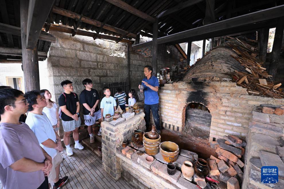 7月18日,在周宁县浦源镇萌源村月山古龙窑,肖家涨(右)在向前来参观研学的华侨大学师生介绍制硋知识。