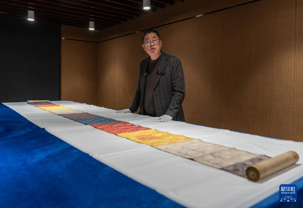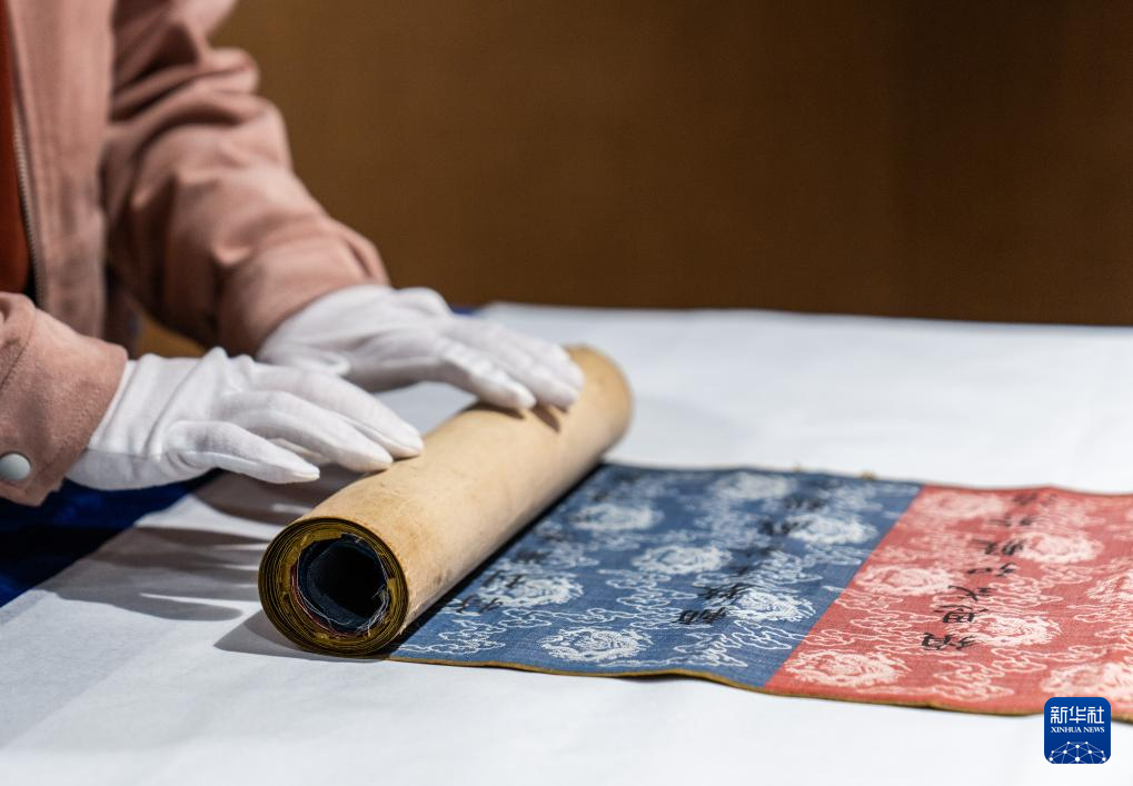 西藏博物馆工作人员将《永乐十一年封斡喃渴烈思巴为辅教王诰书》徐徐展开(5月20日摄)。