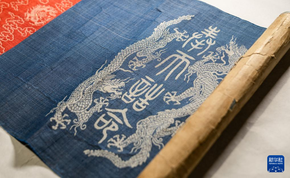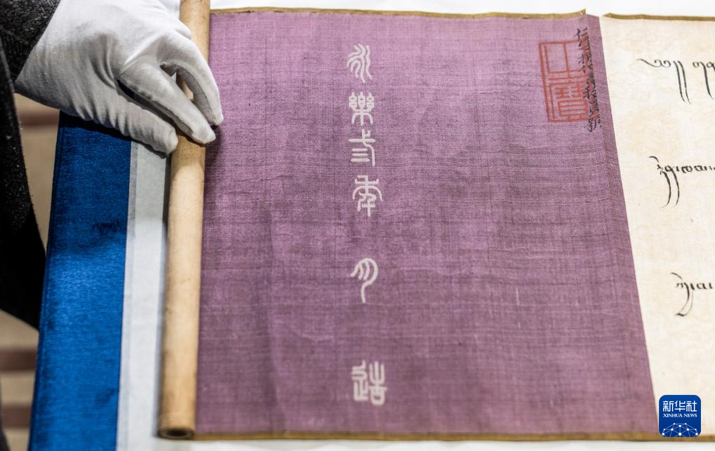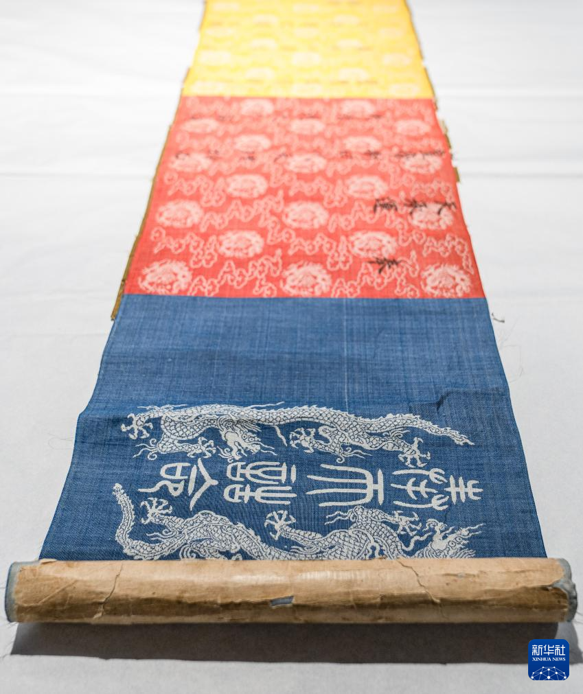 这是《永乐十一年封斡喃渴烈思巴为辅教王诰书》卷首(5月20日摄)。篆书“奉天诰命”四个字和双龙图案均是锦缎织造时应用提花技术以不同色彩的丝线织成。