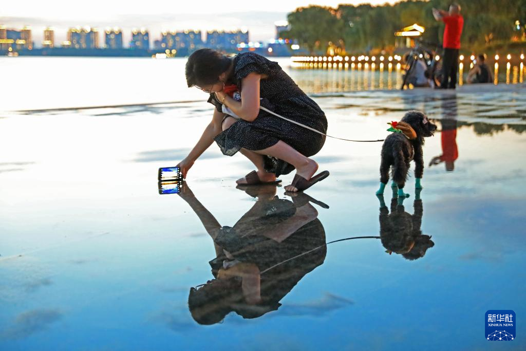 6月30日傍晚,在江苏省宜兴市团氿之滨,市民用手机贴近积水地面拍摄大雨过后的景象。