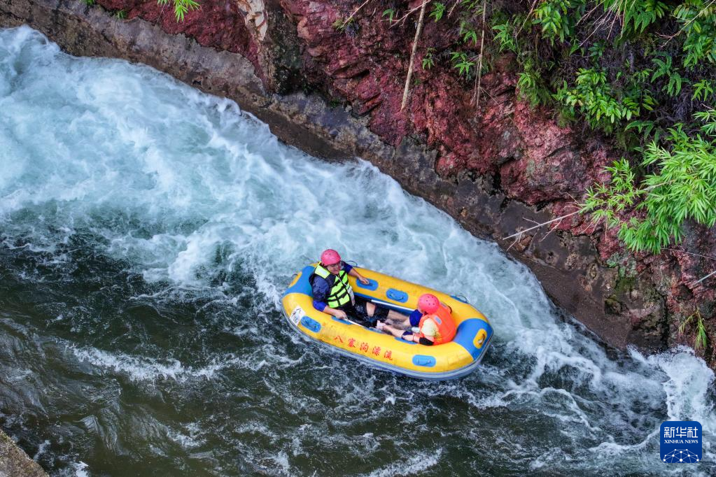 7月26日,在广西钦州市八寨沟景区,游客体验漂流(无人机照片)。