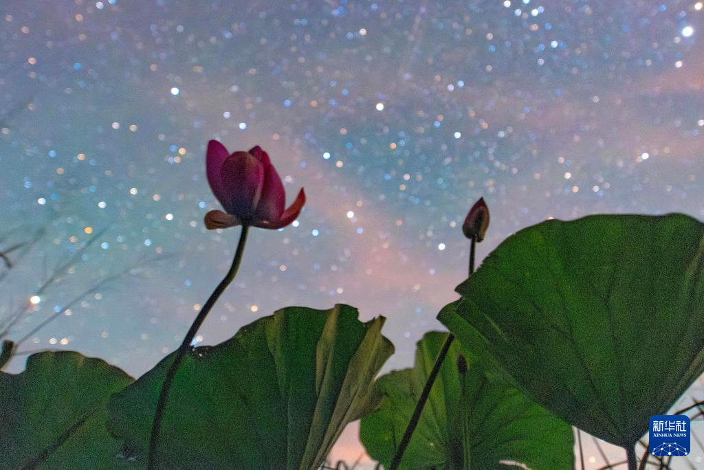 8月4日在位于黑龙江省富锦市的黑龙江三环泡国家级自然保护区拍摄的星空下的荷花。