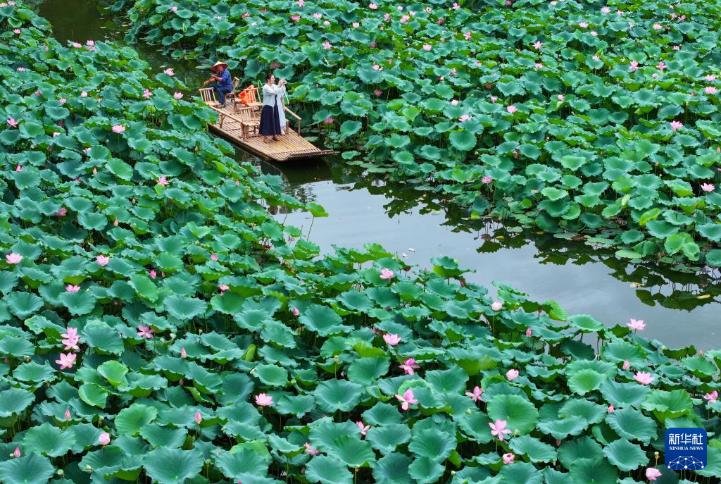7月10日,游人在江苏南京玄武湖公园赏荷(无人机照片)。