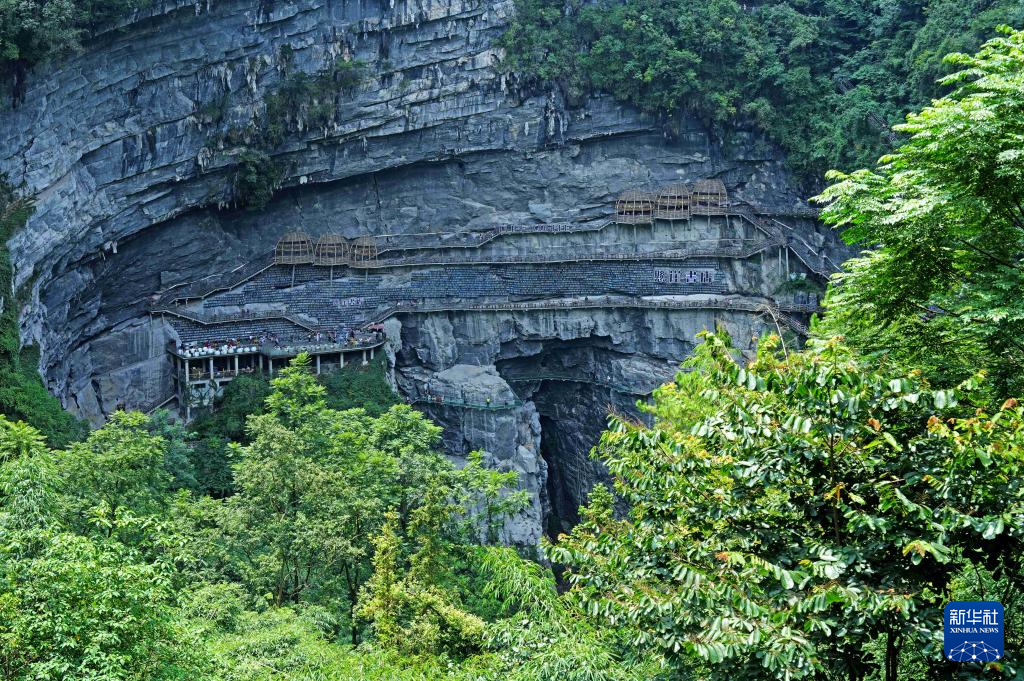 这是8月9日拍摄的广西河池市罗城仫佬族自治县棉花天坑景区内的悬崖书店。