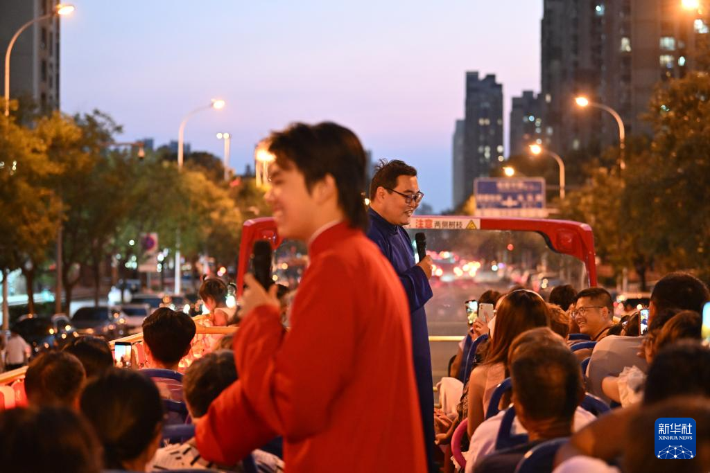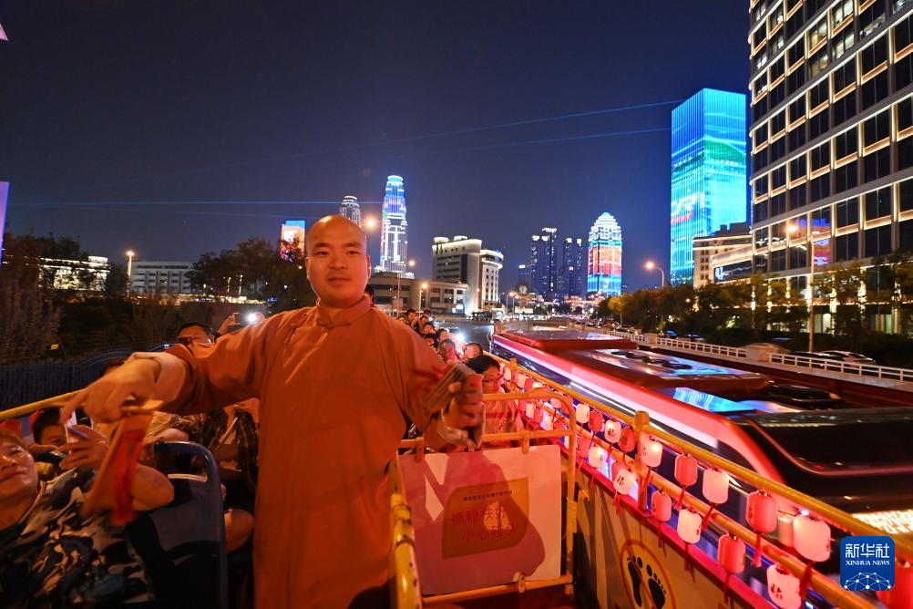 华灯初上,在天津市中心城区的海河岸边,一辆满载欢声笑语的双层“相声巴士”往来穿梭于古文化街、“天津之眼”摩天轮等地标景点间,为游人带来全新的夜游体验。