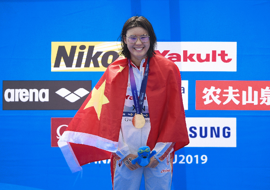 Xin Xin holds the Chinese national flag at the award ceremony of the women's 10km open water swimming at the 18th FINA World Championships on July 14, 2019. Xin Xin finishes first in one hour 54 minutes and 47.20 seconds, 0.90 seconds ahead of Haley Anderson of the United States. (Xinhua/Xia Yifang)