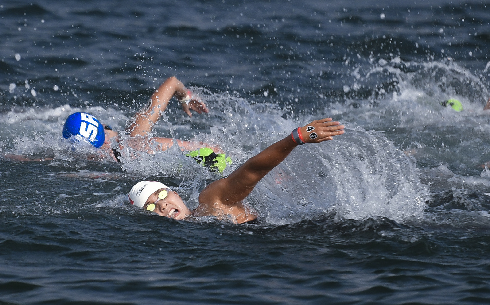 Xin Xin (white swimming cap) competes in the women's 10km open water swimming at the 18th FINA World Championships on July 14, 2019. (Xinhua/Xia Yifang)