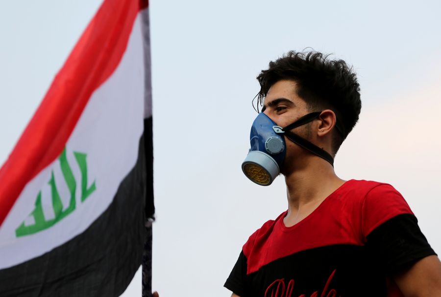 A protester waves flag in Baghdad, Iraq, on Nov. 5, 2019. (Xinhua/Khalil Dawood)