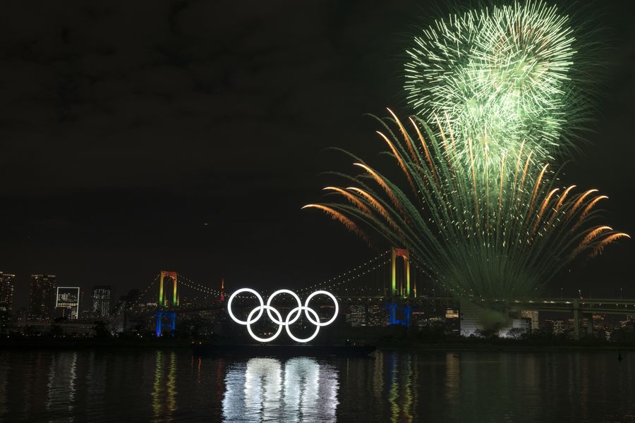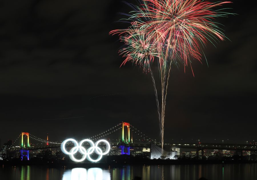 Fireworks explode over the illuminated Olympic rings during an event to mark six months before the opening of the Tokyo 2020 Olympic Games in Tokyo, Japan, on Jan. 24, 2020. (Xinhua/Wang Zijiang)