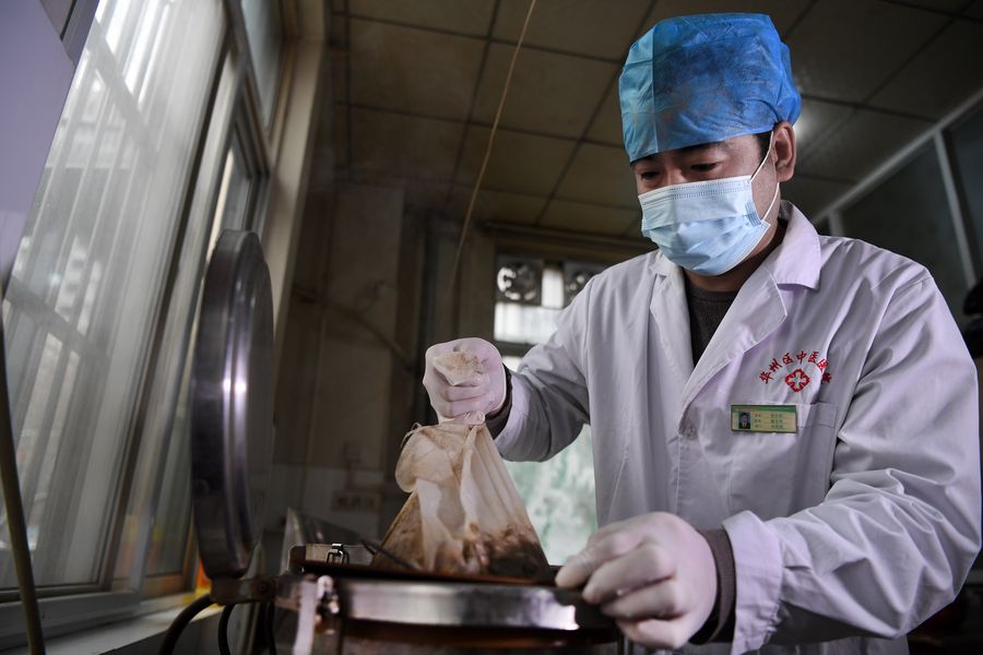 Medical staff work at a traditional Chinese medicine pharmacy in Weinan City, northwest China's Shaanxi Province, Feb. 20, 2020. (Xinhua/Tao Ming)