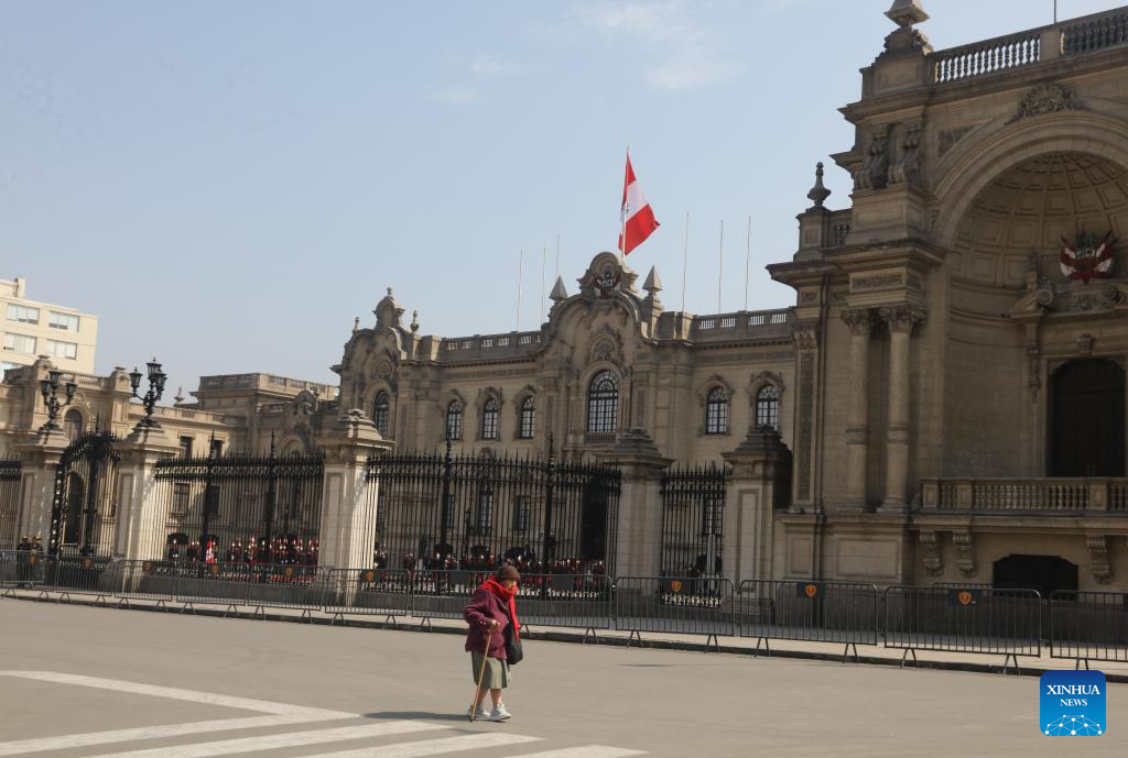 An old woman walks past the Government Palace in Lima, Peru, Oct. 10, 2025. (Xinhua/Mariana Bazo)