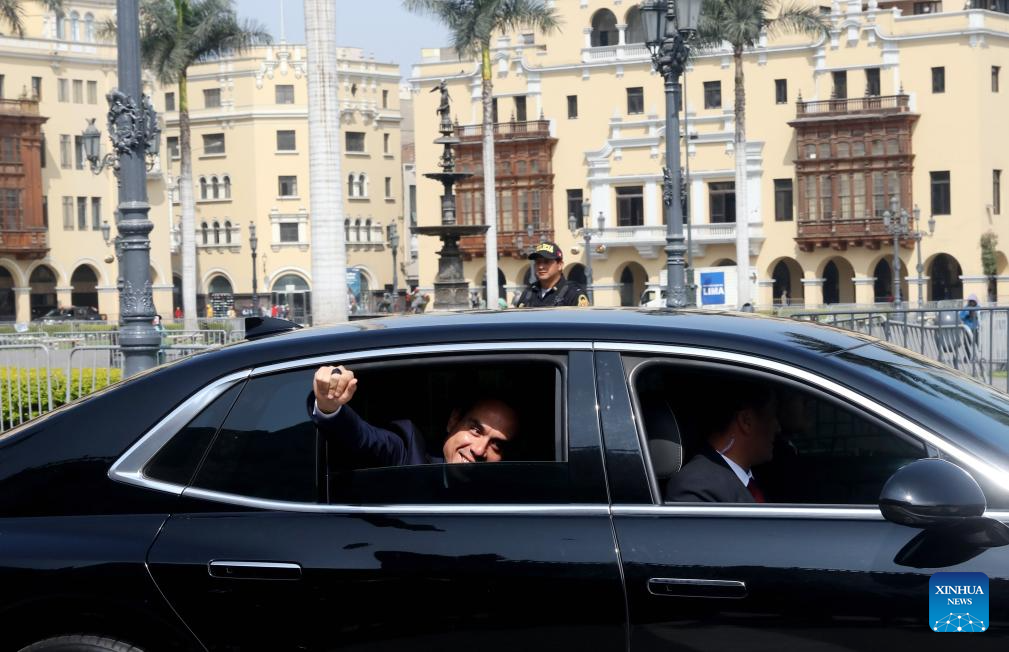 Peruvian President Jose Jeri arrives by car at the Government Palace in Lima, Peru, Oct. 10, 2025. (Xinhua/Mariana Bazo)