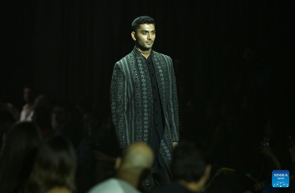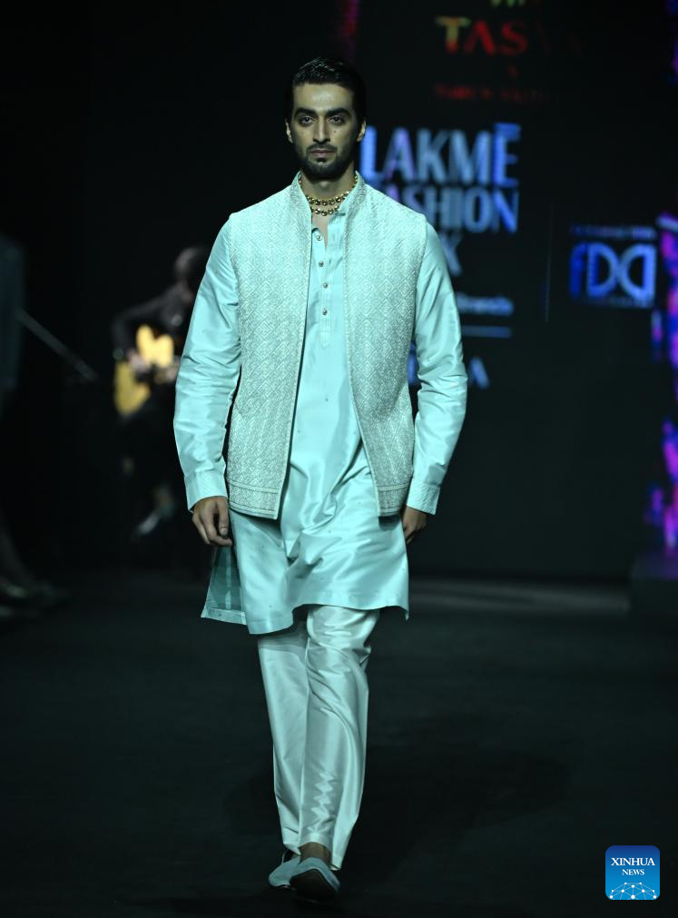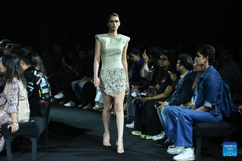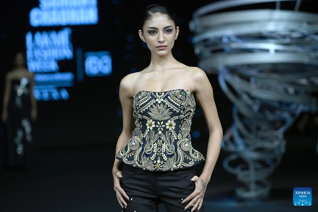 A model presents a creation by British designer Maximilian during Lakme Fashion Week x FDCI in New Delhi, India, Oct. 10, 2025. (Xinhua/Javed Dar)