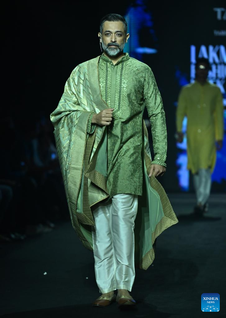 A model presents a creation by Indian designer Tasva during Lakme Fashion Week x FDCI in New Delhi, India, Oct. 10, 2025. (Xinhua/Javed Dar)
