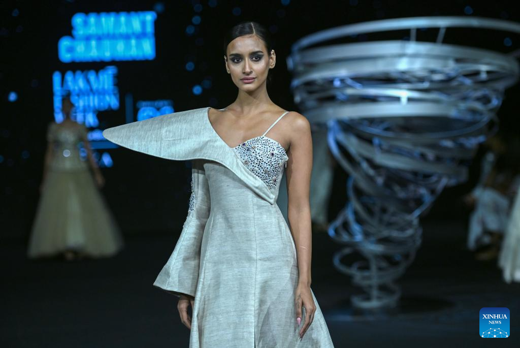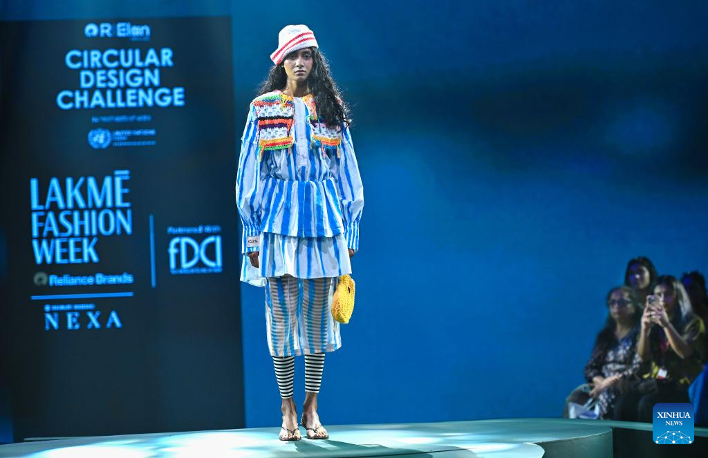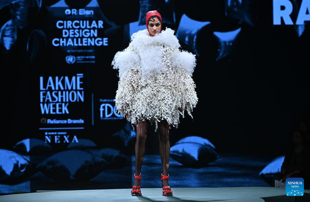 A model presents a creation by Italian designer Martina Boero during Lakme Fashion Week x FDCI in New Delhi, India, Oct. 10, 2025. (Xinhua/Javed Dar)