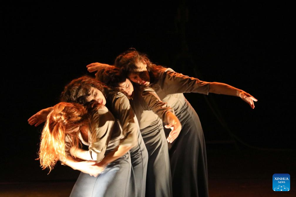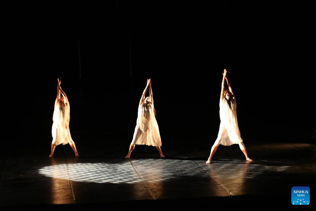Artists from Spanish contemporary theatre and dance troupe HOJARASCA perform during the sixth edition of Baghdad International Theatre Festival, in Baghdad, Iraq, on Oct. 11, 2025. (Xinhua/Khalil Dawood)