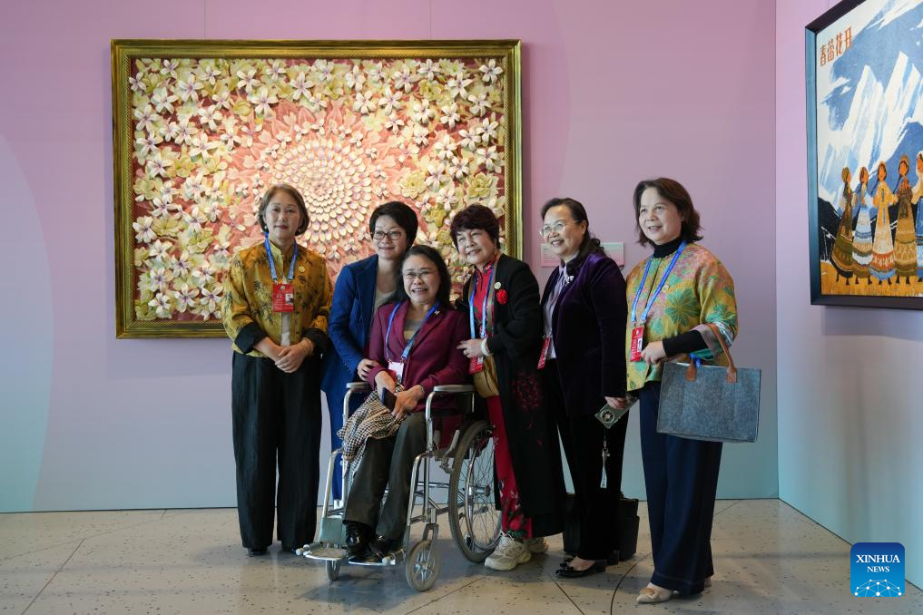Women visit "Heritage Blossoms, Women Shine", a special exhibition celebrating the Global Leaders' Meeting on Women in Beijing, capital of China, Oct. 13, 2025. The Global Leaders' Meeting on Women was held in Beijing on Monday. (Xinhua/Yan Linyun)