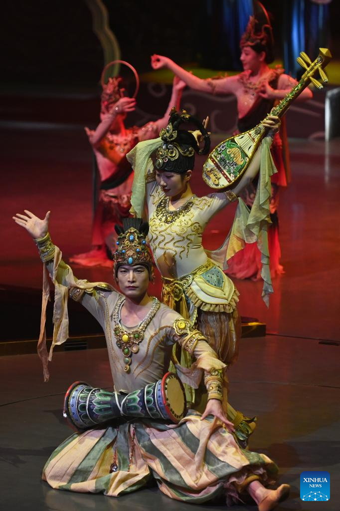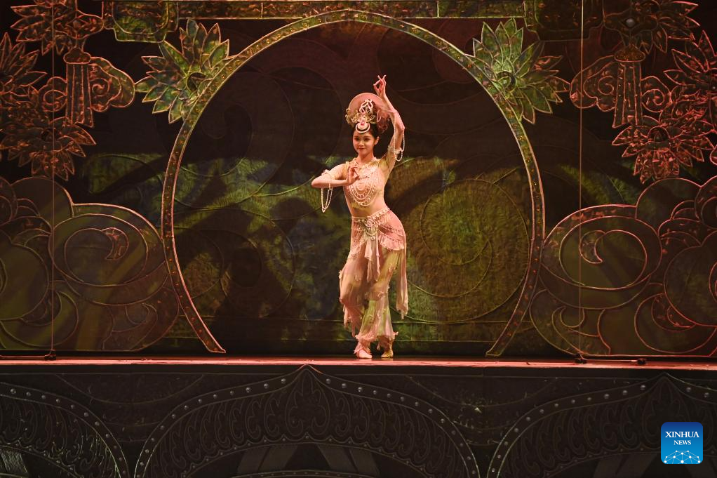 An immersive drama titled "Ancient Sound of Dunhuang" is staged for guests attending the Global Mayors Dialogue -- Dunhuang event, in Dunhuang, northwest China's Gansu Province, Oct. 12, 2025. (Xinhua/Fan Peishen)