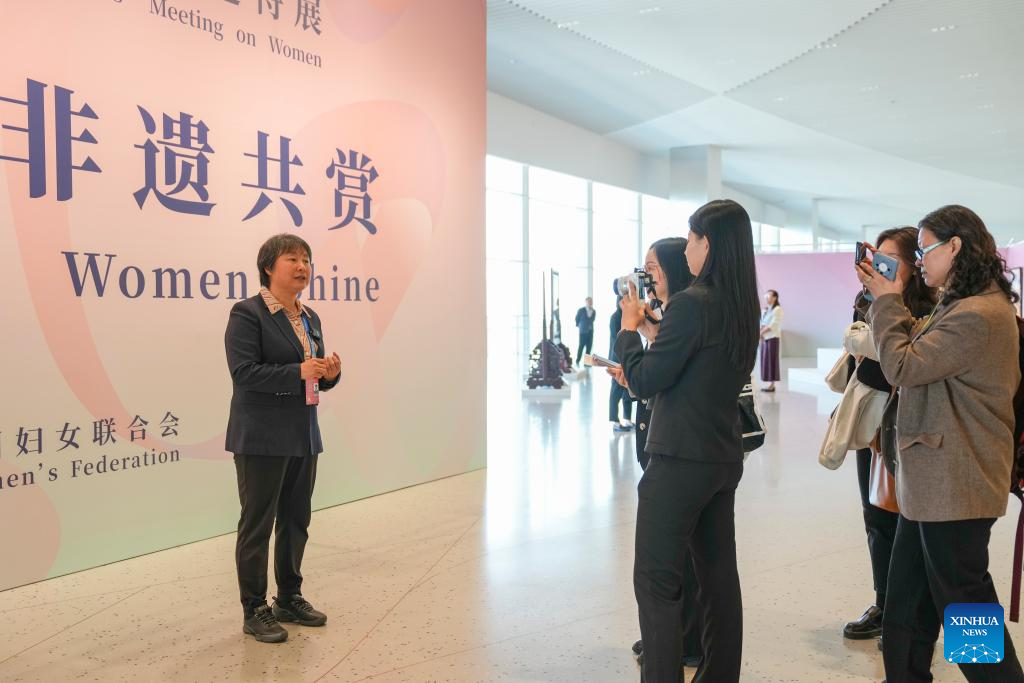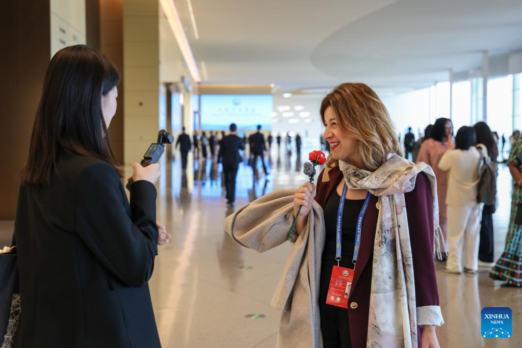 A journalist interviews a guest at the Global Leaders' Meeting on Women in Beijing, capital of China, Oct. 13, 2025. The Global Leaders' Meeting on Women was held in Beijing on Monday. (Xinhua/Liu Weibing)