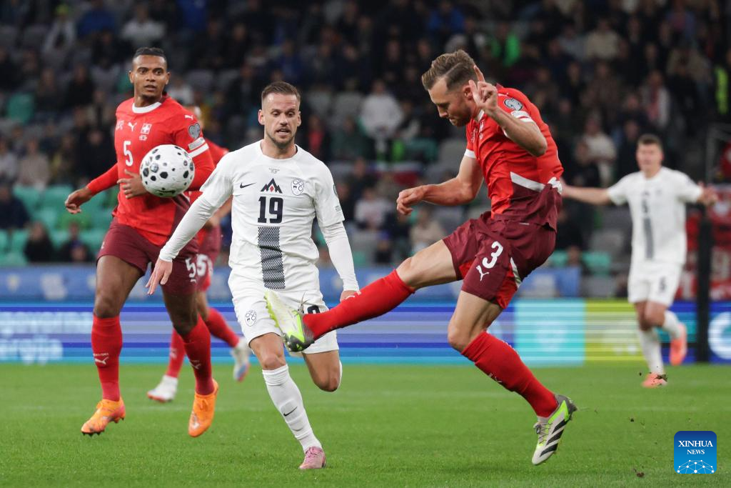 Miro Muheim (L) of Switzerland shoots during the World Cup 2026 European Qualifiers Group B football match between Slovenia and Switzerland in Ljubljana, Slovenia, Oct. 13, 2025. (Photo by Zeljko Stevanic/Xinhua)