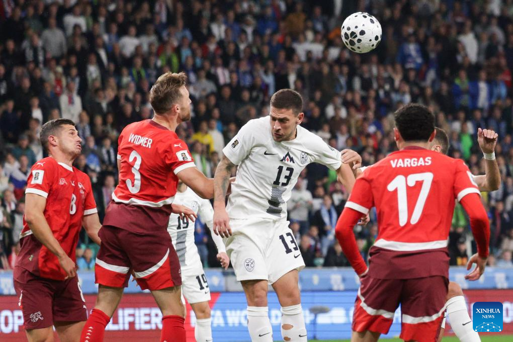 Erik Janza (C) of Slovenia competes for a header with Silvan Widmer of Switzerland (front 2nd L) during the World Cup 2026 European Qualifiers Group B football match between Slovenia and Switzerland in Ljubljana, Slovenia, Oct. 13, 2025. (Photo by Zeljko Stevanic/Xinhua)