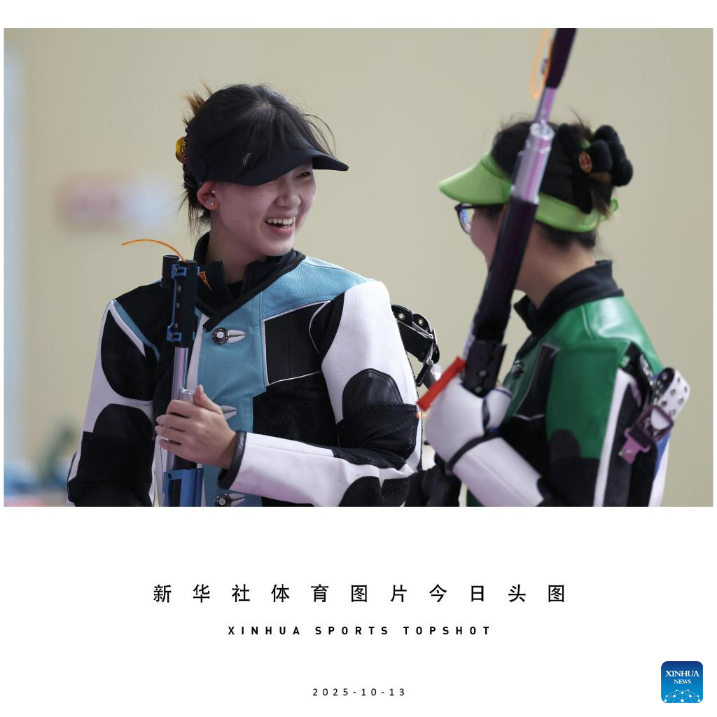 Silver medalist Yan Jinjing (L) of Jiangsu talks with gold medalist Han Jiayu of Zhejiang after the 10m air rifle women's final of shooting at China's 15th National Games in Guangzhou, south China's Guangdong Province, Oct. 13, 2025. (Xinhua/Lu Hanxin)