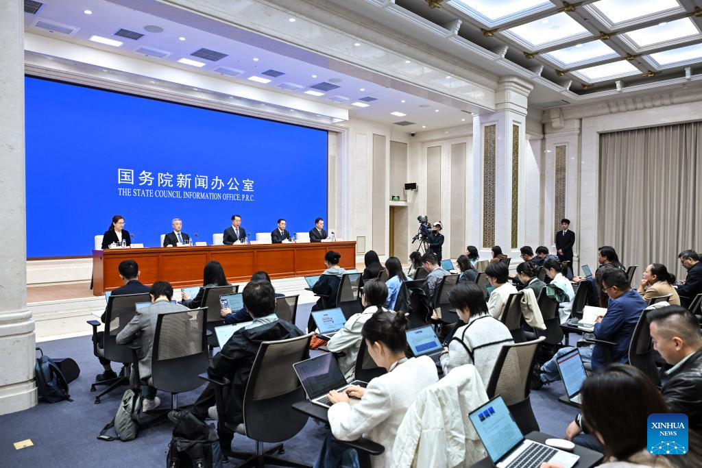 Lu Zhiyuan, China's minister of civil affairs, and Li Changguan, Hu Haifeng, and Liu Zhenguo, all vice ministers of civil affairs, attend a press conference held by the State Council Information Office (SCIO) on achievements in civil affairs during the 14th Five-Year Plan period (2021-2025) in Beijing, capital of China, Oct. 10, 2025. (Xinhua/Li Xin)