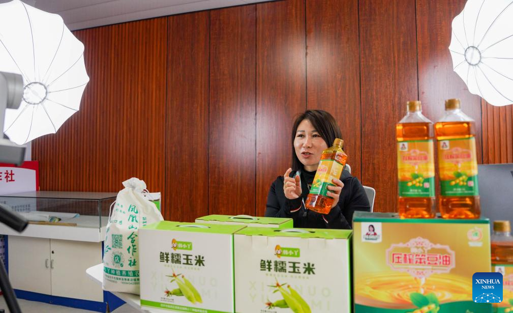 Han Fengxiang promotes the agricultural products of her cooperative through live streaming in Lishu County, northeast China's Jilin Province, Oct. 9, 2025. Han Fengxiang, 43, returned to her hometown in Jilin's Lishu County to run a cooperative in 2010. Instead of relying on traditional farming methods, Han carried out mechanized farming leveraging large-scale agricultural machinery to enhance the grain output. With years of operation, the cooperative currently boasts 76 sets of large agricultural machinery and manages 1,000 hectares of land with mechanized cultivation.