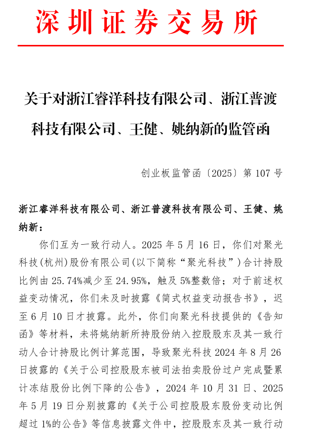 8月13日晚,深交所发布公告称,浙江睿洋科技有限公司、浙江普渡科技有限公司、王健、姚纳新互为一致行动人。因对聚光科技(杭州)股份有限公司合计持股比例减少(持股比例由25.74%减少至24.95%)未及时披露《简式权益变动报告书》,且控股股东及其一致行动人合计持股比例信披不准确,被深交所出具监管函。上述相关行为违反了《上市公司收购管理办法》及《创业板股票上市规则》的规定,深交所要求整改并提醒合规交易及履行信披义务。