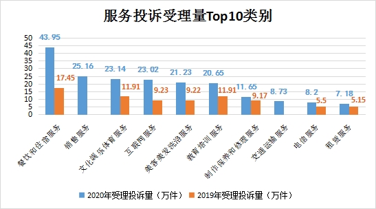 服務(wù)投訴排名靠前的是:餐飲和住宿服務(wù)43.95萬件,銷售服務(wù)25.16萬件,文化娛樂體育服務(wù)23.14萬件,互聯(lián)網(wǎng)服務(wù)23.02萬件,美容美發(fā)洗浴服務(wù)21.23萬件。