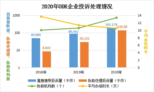 2020年,市場監(jiān)管部門大力推進在線糾紛和解機制建設(shè),努力把消費糾紛化解在源頭、解決在基層、和解在企業(yè)。全國12315平臺共發(fā)展ODR企業(yè)2.55萬家,主動與消費者協(xié)商糾紛19.22萬件,與傳統(tǒng)調(diào)解方式相比,和解率高出6.21個百分點,平均處理時長縮短7.76天,消費者滿意度4.07分(滿分5分),ODR城市覆蓋率由25.60%增加到91.11%。與2019年相比,2020年ODR機制運行質(zhì)量有了明顯提高,投訴處理量、辦理效率、和解成功率、消費者滿意度等各方面均有明顯提升,維權(quán)效能日益突顯。