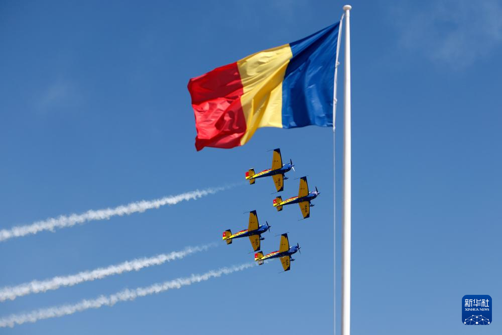 8月30日,来自罗马尼亚的特技飞行表演队在布加勒斯特国际航展上进行飞行表演。