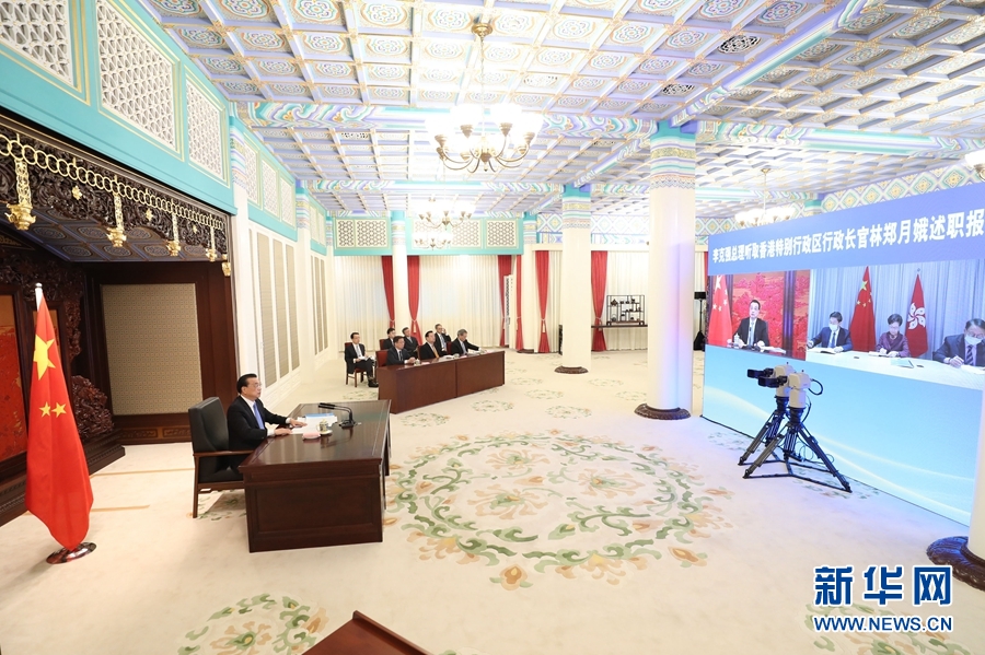1月27日,國(guó)務(wù)院總理李克強(qiáng)在北京中南海紫光閣以視頻連線方式聽取香港特別行政區(qū)行政長(zhǎng)官林鄭月娥2020年度的述職報(bào)告。國(guó)務(wù)院副總理韓正出席。新華社記者 王曄 攝