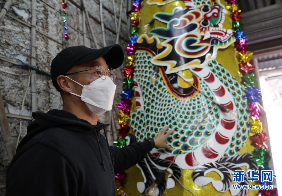 花牌師傅黎俊霖介紹“飛龍?jiān)谔臁饼堉?月25日攝)。新華社記者 李鋼 攝