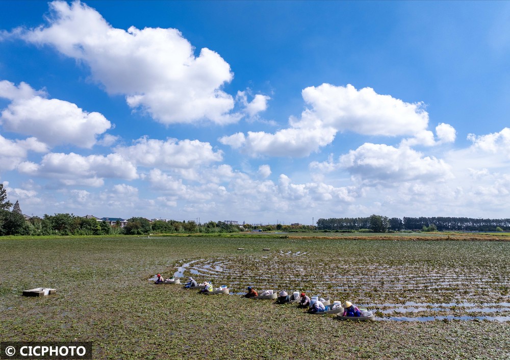 ↑2025年9月23日,江苏省泰州市海陵区苏陈镇张家院社区村民在采摘菱角。(无人机照片)CICPHOTO/汤德宏 摄