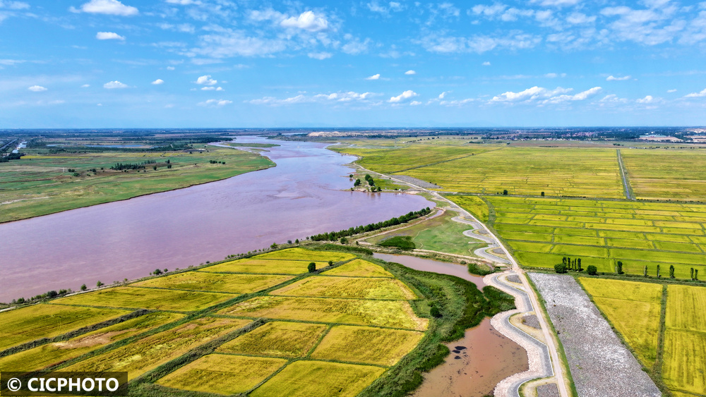 ↑2025年9月17日,宁夏银川市兴庆区月牙湖乡黄河两岸的稻田丰收在望。(无人机照片)CICPHOTO/袁宏彦 摄