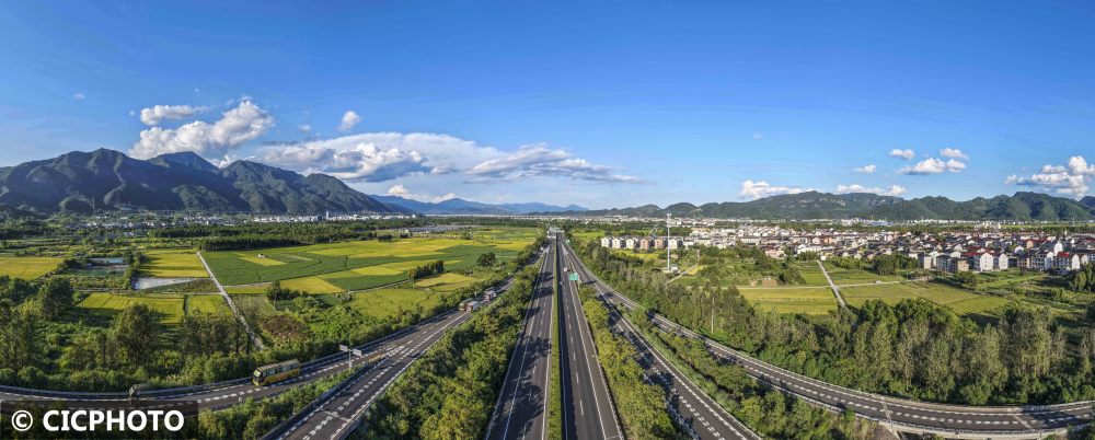 ↑2025年9月28日,车辆行驶在浙江省台州市仙居县白塔镇境内的高速公路上。(无人机全景照片)CICPHOTO/陈月明 摄