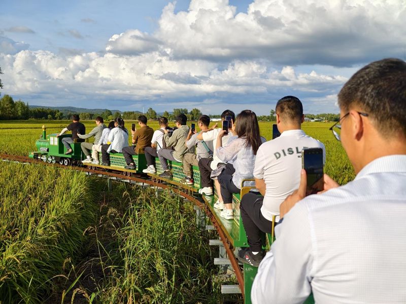 2025年8月25日,游客在黑龙江省伊春铁力市工农乡北星村的稻田小火车上游玩。新华网记者 钟奕 摄