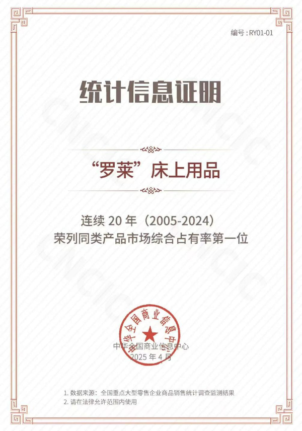 以精工品质为根基,融合智能科技革新,罗莱生活赢得了众多消费者的信赖。2005 年至今,罗莱床上用品连续20年荣列同类产品市场综合占有率第一。未来也将继续通过智能化产品创新,为消费者构建更完善的健康睡眠解决方案。