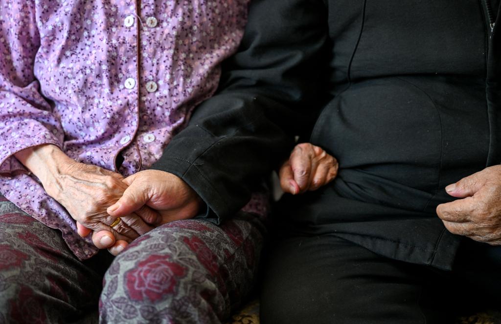 2024年11月20日,都贵玛和扎拉嘎木吉(右)合影时,紧握对方的手。