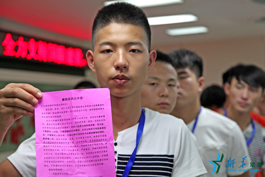 ????新華網(wǎng)鄭州8月11日電(雒根生)“當兵入伍是為國家做貢獻盡義務(wù),不需要繳納任何費用。凡是以幫忙找關(guān)系為由要錢要物的情形,都是騙人的!”河南省武陟縣喬廟鄉(xiāng)18周歲的預征對象王云祥10日收到了武陟縣征兵辦印制的《廉潔征兵公開信》。為確保不發(fā)生一起違反征兵政策現(xiàn)象,武陟縣征兵辦公室專門印制1000份廉潔征兵公開信發(fā)放給每一位參檢對象及家長,并公布了省市縣三級監(jiān)督舉報電話。