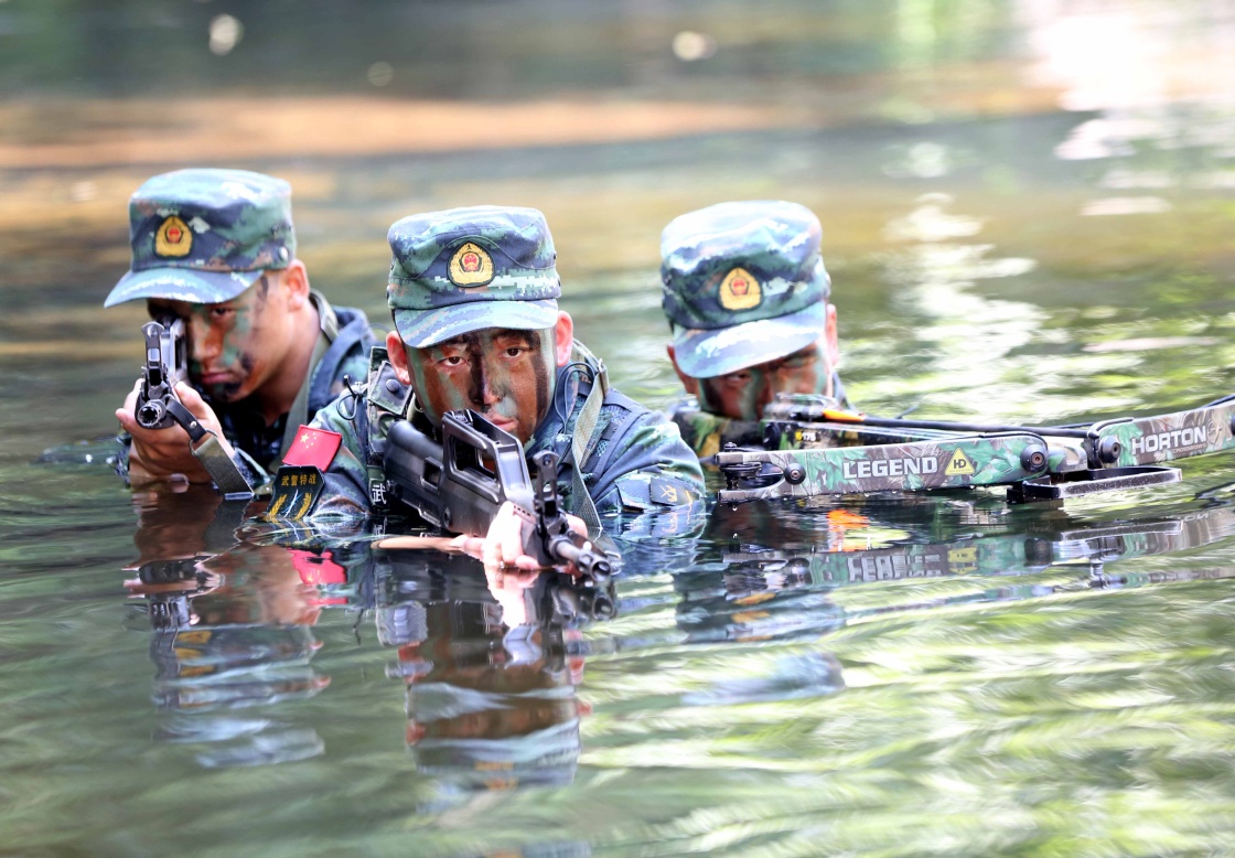 ????當(dāng)日,武警山東總隊(duì)煙臺(tái)支隊(duì)組織特戰(zhàn)狙擊手冒著34攝氏度的高溫來到昆崳山開展叢林訓(xùn)練。狙擊手們身穿偽裝服圍繞野外生存、偽裝潛伏、極限體能等6項(xiàng)17個(gè)課目進(jìn)行綜合訓(xùn)練,在實(shí)戰(zhàn)背景下磨礪狙擊手野外生存技能和戰(zhàn)術(shù)素養(yǎng),鍛造反恐處突利刃。新華社記者 朱崢 攝