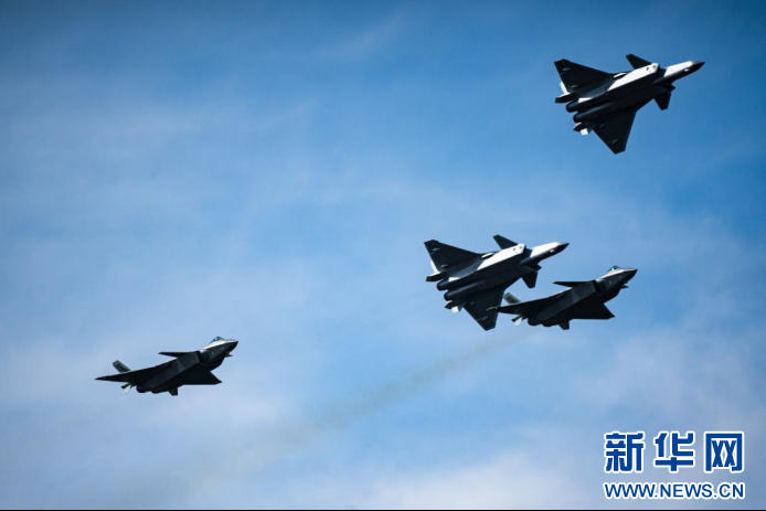 9月20日,歼-20进行四机编队机动飞行展示。新华网 丁梓朔 摄