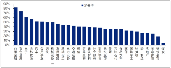 万联证券研究所策略首席分析师宫慧菁也分析称,截至7月15日,按申万一级行业分类,2025年中报业绩预喜率最高的五个行业为非银金融、有色金属、综合、电子和农林牧渔行业。