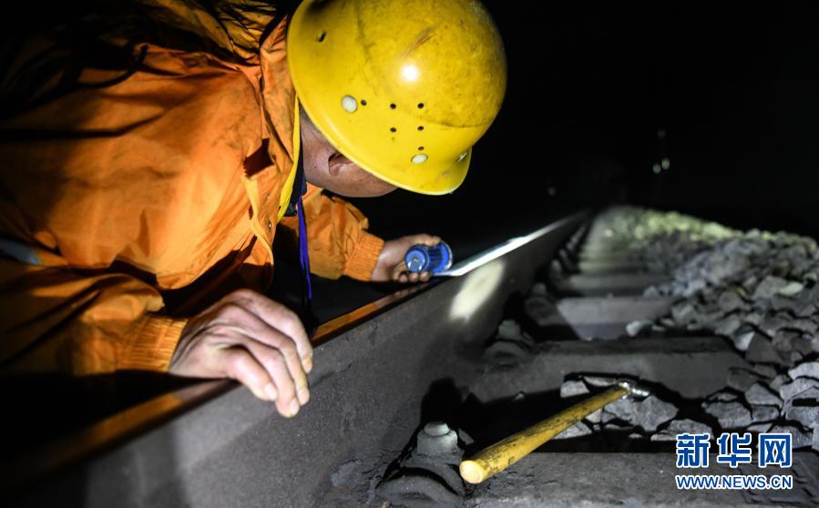在廣西河池境內(nèi)黔桂鐵路線上的鄧山隧道,中國鐵路南寧局集團有限公司柳州工務(wù)段的4名看守工輪換值班,依靠手電筒在黑暗中穿行,及時巡查隧道中可能出現(xiàn)的各種隱患,確保每天經(jīng)隧道運行的59趟客貨列車春運安全。鄧山隧道全長773米,是一個需要人員全天候看守的鐵路隧道。