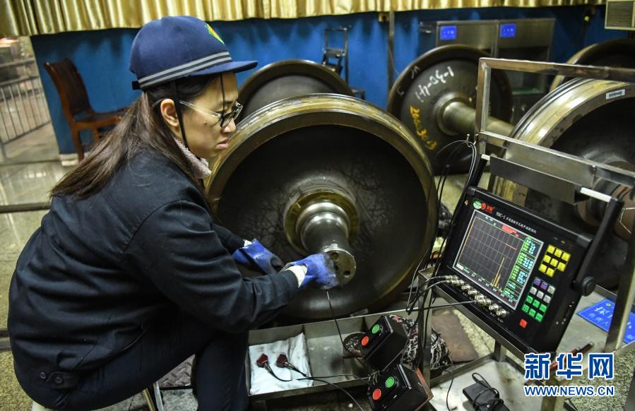 2月1日,柳州車輛段車輪車間無(wú)損檢測(cè)員黃婷對(duì)輪對(duì)進(jìn)行探傷檢查。新華社記者 張愛(ài)林 攝